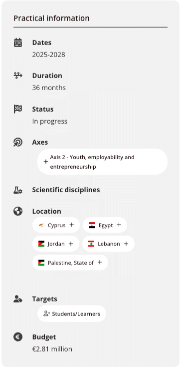 The EUSEEDS project aims to deploy 20 university centers in five countries of the Eastern Mediterranean (Cyprus, Egypt, Jordan, Lebanon and Palestine) in order to strengthen the employability and digital skills of young people.